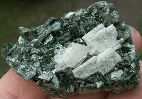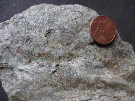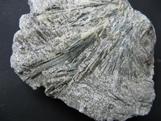 Actinolite. Terme courant du groupe des amphiboles calciques, elle forme une série avec la trémolite et une autre avec la ferro-actinolite. Elle se présente sous forme de cristaux très allongés pouvant atteindre 15 cm, d’agrégats fibro-radiés (d’où le nom dérivé du grec ancien), ou en masses. Sa couleur est le plus souvent vert bouteille avec différentes nuances allant du gris clair verdâtre au vert foncé. C’est un produit du métamorphisme régional de faible et moyen degrés, du métamorphisme de contact de roches basiques et ultramafiques et de dolomies.
