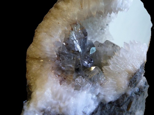 Célestite et calcite dans une loge d’ammonite du Sinémurien. Boyeux-Saint-Jérôme. Largeur de la pièce 52mm. (photo géolhobby)