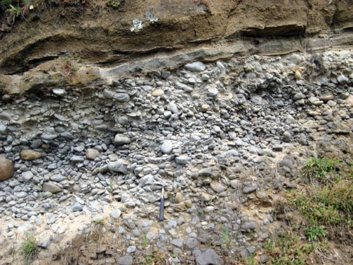 Au Nord de Blassac (Haute-Loire / France), spectaculaire coupe dans les alluvions anciennes de l'Allier (Villafranchien). La formation fluviatile (dont l'épaisseur est généralement de l'ordre du mètre) est recouverte par une coulée de basalte.