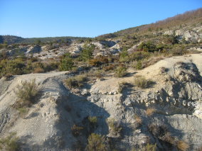 Juste avant d'arriver sur le col de Lazarier, nous effectuons une halte au col de la Pertie. Nous avons une belle vue d'ensemble sur le site. En regardant vers le sud, nous voyons sur la droite les barres calcaires jurassiques (Tithonien, fin du Jurassique, 150 millions d'années). Ces calcaires durs forment des falaises abruptes. En déplaçant notre regard vers la gauche, nous rencontrons des couches de plus en plus récentes et nous parcourons le Crétacé inférieur. Le Valanginien (130 millions d'années) occupe la dépression. On y observe l'important travail de l'érosion qui sculpte les marnes en ravins et ne permet pas à la végétation de se développer. Sur la gauche, l'Hauterivien (120 millions d'années) affleure sur les pentes du Serre Malivert. Il est constitué d'une succession de marnes et de bancs calcaires : l'érosion y a moins de prise et la végétation est plus abondante. Le sommet du Serre Malivert est formé des roches du Barrémien (115 millions d'années) qui se développent bien sur l'autre versant. Nous constatons donc que la Valanginien affleure dans des dépressions. Il se compose essentiellement de marnes de couleur gris-bleuté (bien visible dans les ravins) et s'altère superficiellement en jaune (davantage visible dans les zones moins ravinées). On observe également de petits bancs calcaires très marneux. Certains bancs calcaires en plaquettes s'avèrent assez riches en fossiles d'ammonites (pyriteuses ou non).