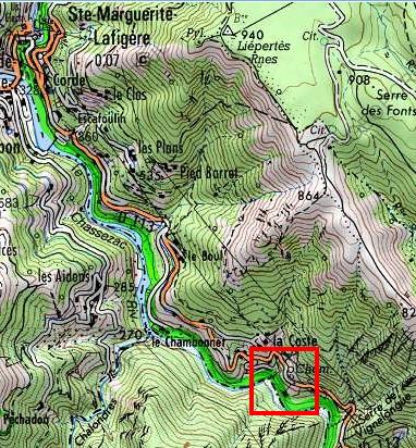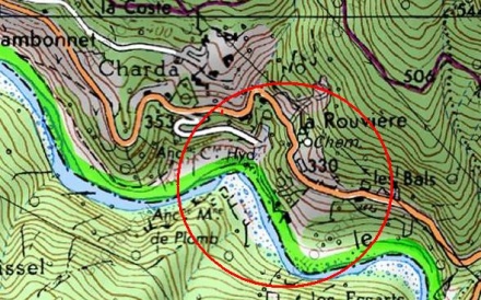 Le site qui nous intéresse est en fait à cheval sur deux départements : au nord du Chassezac (rive gauche) la zone dite de La Rouvière située en Ardèche et au sud du Chassezac (rive droite) la zone dite des Essarts (ou Issarts) située dans le Gard.