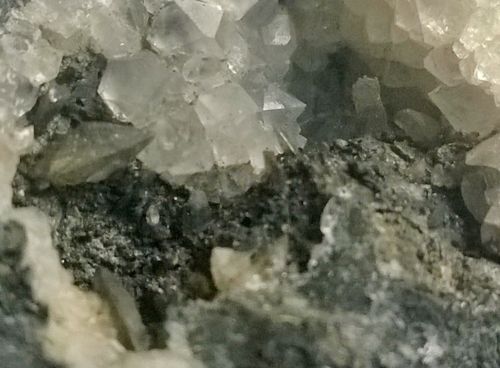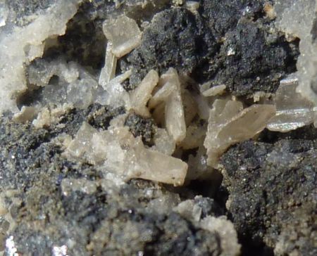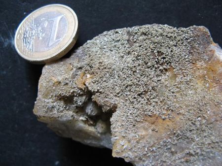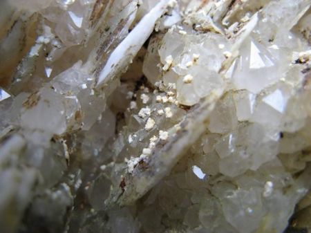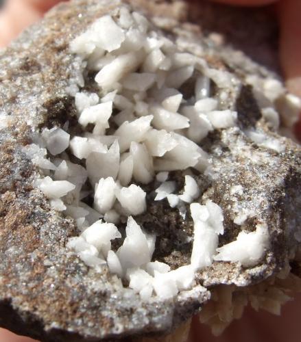 Près du pont, des déblais (encore et partout!!) dans lesquels on découvre de la calcite en pétales et quelques géodes de calcite en jolies pointes blanches :