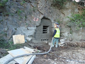 La solution consiste à obturer l’entrée des galeries avec un épais mur en béton armé dans lequel une lucarne est aménagée, équipée de barreaux en acier. Ces barreaux sont scellés à l’horizontale avec un espacement (13 cm) suffisant pour permettre à la plupart des chauves-souris de passer en vol. Ils sont en revanche infranchissables pour une personne. Il a également été demandé, sur les galeries les plus intéressantes pour les chauves-souris, que l’un de ces barreaux, équipé d’un système de fermeture adapté, puisse coulisser dans le mur. Objectif : permettre aux spécialistes des chauves-souris d’entrer dans les galeries afin de poursuivre le suivi hivernal des populations initié dans le cadre du programme LIFE.