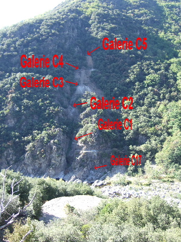 Sur ce flanc, de bas en haut : galerie C17,C1,C2,C3,C4,et C5 (numéro inscrit à l'entrée de chaque galerie) :
