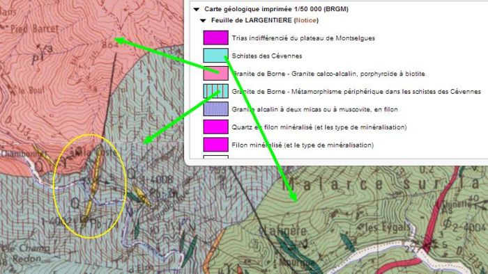 La minéralisation semble associée à la faille de Villefort d'orientation Nord-Sud qui a pu rejouer au Trias et au Lias, permettant la minéralisation filonienne par circulation des fluides hydrothermaux.