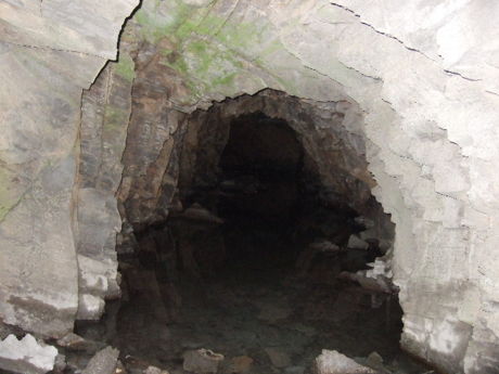En bas des haldes, près d'une petite zone plate, la galerie 4 ou "C7" (galerie dite du Chassezac d'où un petit ruisselet s'écoule) :