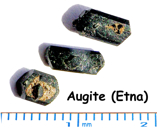 - Conditions de formation et/ou de gisement : L'augite est l'un des minéraux principaux des roches ignées, en particulier basiques et ultrabasiques (gabbros, basaltes, pyroxénites. Présent dans les roches lunaires. Présent dans des météorites.