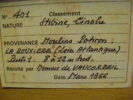- Échantillons de collection : Tsar Tien mine, Pa-lo, Hunan, Chine ; Almadén, Espagne ; Moschellandsberg, Allemagne ; Monte Amiata, Toscane, Italie ; Idria, Slovénie ; Tchécoslovaquie (Rudnany) ; URSS (Nikitovka) ; USA (Terlingua, New Idria, New Almaden) …