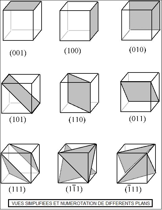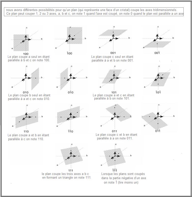 • Les faces se notent entre parenthèses : (010) où le premier chiffre est relatif à l'axe a, le deuxième, à l'axe b, le troisième, à l'axe c. (a, b, c peuvent être surmontés d'une petite flèche…).