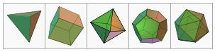 Les cinq polyèdres réguliers convexes (solides de Platon) sont : le tétraèdre, l'hexaèdre (ou cube), l'octaèdre, le dodécaèdre et l'icosaèdre :