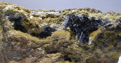 - Goethite : en cristaux bien définis de 5 à 6 cm. Trois habitus ont été trouvés : en lattes, en cristaux lancéolés et en aiguilles.