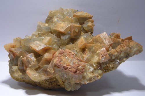 - Barytine : elle est massive, surtout, et on ne trouve des cristaux que dans les géodes : de quelques mm à centimétriques avec du quartz, avec une foultitudes d'habitus très variés, comme les coloris : du blanc au beige, gris, rouge hématoïde ou bleu (le plus recherché).