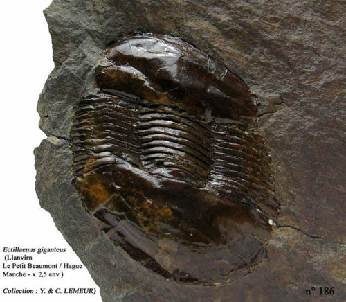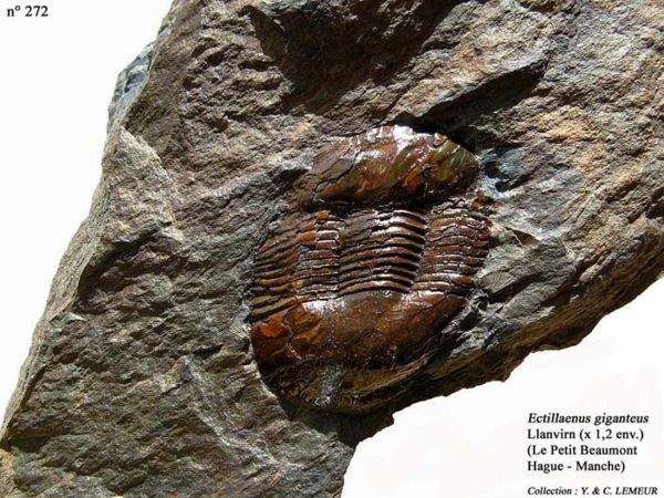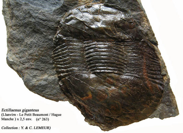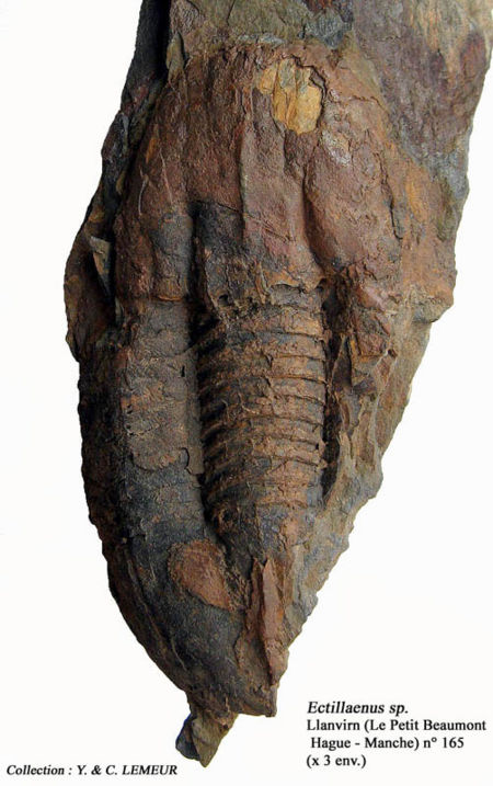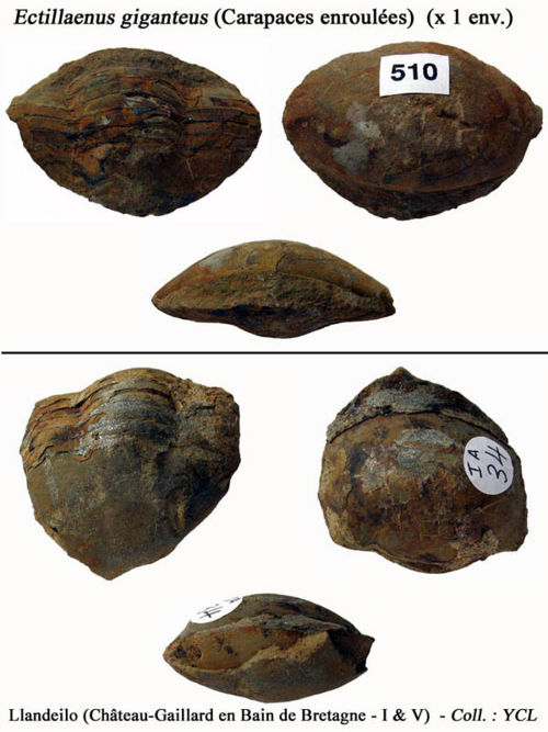 Au Petit-Beaumont / Hague (Manche), les carapaces du genre Ectillænus sont souvent complètes et peu déformées ; les organismes sont sans doute autochtones. On peut constater une certaine diversité quant à la forme générale de la carapace : des carapaces paraboliques relativement larges (rapport Longueur Totale de la Carapace/Largeur Totale de la Carapace (LTC/lTC) proche de 1,2 à 1,3 ), des carapaces oblongues, le rapport LTC/lTC pouvant atteindre 2. La carapace n° 165 présente ainsi une forme particulièrement élancée, un céphalon dont la longueur équivaut pratiquement à sa largeur. Les sillons dorsaux sont très profonds (voir photo n° 15 &17) et une ride médiane parcourt l’axe glabellaire (voir photo n° 15)(Phénomènes de déformation ?). L’appartenance à l’espèce giganteus peut prêter à discussion… ( ?)