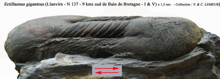 Ectillænus giganteus est un trilobite particulièrement bien représenté dans l’Ordovicien armoricain. C’est un organisme souvent de grande taille, à carapace parabolique, caractérisé par un effacement général de l’ornementation (morphotype des Illænimorphes), sans doute adapté à un mode de vie endobionte (enfouissement en sédiments meubles).