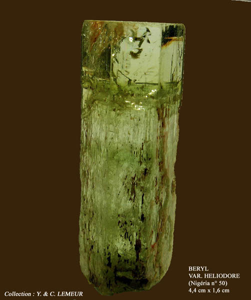 Joli cristal prismatique (4,4 cm), sommet limpide et très brillant ; nombreuses figures de dissolution à la base.