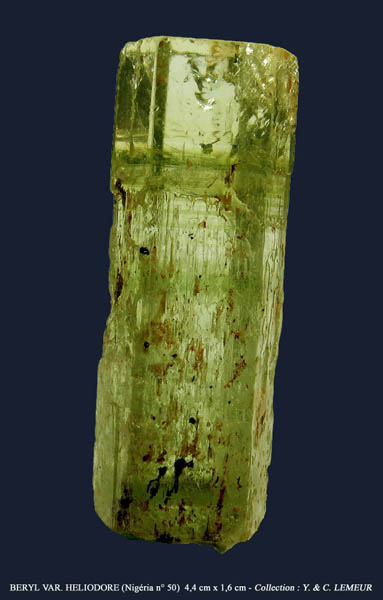 Joli cristal prismatique (4,4 cm), sommet limpide et très brillant ; nombreuses figures de dissolution à la base. (Plateau de Jos - Nigéria)