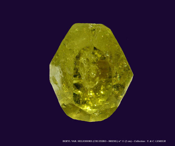Sommet d'un très beau cristal d'Héliodore (2,2 cm de large) de la Cruzeiro Mine ( Brésil). Le centre du cristal est totalement gemme.