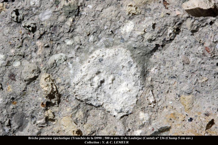 Echantillon issu d’une brèche non stratifiée, non litée et peu indurée. Ciment clair, abondant, soudant des blocs ou fragments variés plus ou moins arrondis, de nature variée (trachy-andésites, calcaires, argiles). Il renferme des pyroclastes automorphes de biotite et de pyroxène qui proviennent de la cristallisation d'un magma rhyolitique et surtout des ponces fibreuses de taille variée (1 cm max.). On y trouve d'autre part de nombreux débris de végétaux. On observe ici des fragments de quartz blanc à limpide, des fragments argileux verdâtres à blanchâtres. Nombreux grains roulés, mica, fragments ponceux blancs, laves anciennes variées, remobilisées. C’est une formation épiclastique provenant du remaniement de nappes ignimbritiques préexistantes dans les parties plus centrales du massif. (voir carte géologique de la France BRGM 1/50000 – Feuille Vic-sur-Cère).