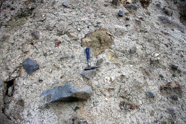 Nous voyons ici des brèches non stratifiées, non litées, plus ou moins friables. Le ciment clair (Jaunâtre/brun/gris) est abondant et soude des blocs décimétriques (parfois métriques) plus ou moins arrondis, de nature variée (trachy-andésites, calcaires, argiles, concentrations siliceuses...). Présence de ponces fibreuses de taille variée (1 cm max.). On observe de nombeux débris de végétaux.
