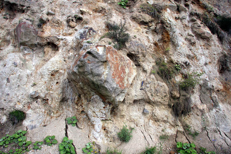Nous voyons ici des brèches non stratifiées, non litées, plus ou moins friables. Le ciment clair (Jaunâtre/brun/gris) est abondant et soude des blocs décimétriques (parfois métriques) plus ou moins arrondis, de nature variée (trachy-andésites, calcaires, argiles, concentrations siliceuses...). Présence de ponces fibreuses de taille variée (1 cm max.). On observe de nombeux débris de végétaux.