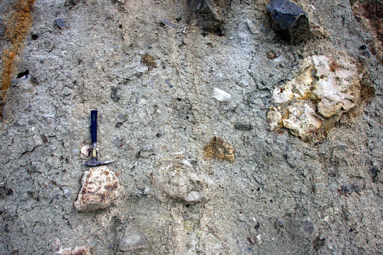 Nous voyons ici des brèches non stratifiées, non litées, plus ou moins friables. Le ciment clair (Jaunâtre/brun/gris) est abondant et soude des blocs décimétriques (parfois métriques) plus ou moins arrondis, de nature variée (trachy-andésites, calcaires, argiles, concentrations siliceuses...). Présence de ponces fibreuses de taille variée (1 cm max.). On observe de nombeux débris de végétaux.