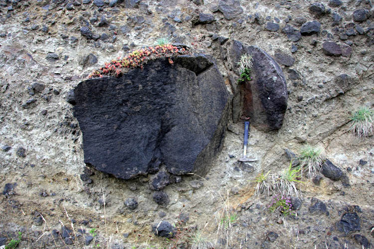 Imposant bloc dans la brèche supérieure stratifiée du Cantal.