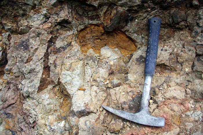 Brèche chaotique plus ou moins indurée, composée d'un ciment clair (gris, beige, ocre), abondant, soudant des blocs décimétriques plus ou moins arrondis, de nature variée (Trachy-andésites, calcaires, argiles...). Présence de débris végétaux. Formation épiclastique (Lahars) provenant du remaniement des nappes ignimbritiques des parties plus centrales du massif cantalien.