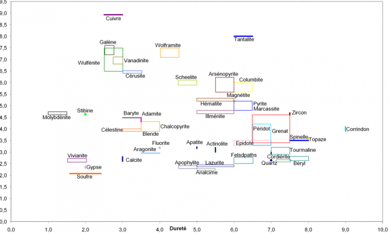 Graphe présentant les domaines de densité et de dureté de certains minéraux communs