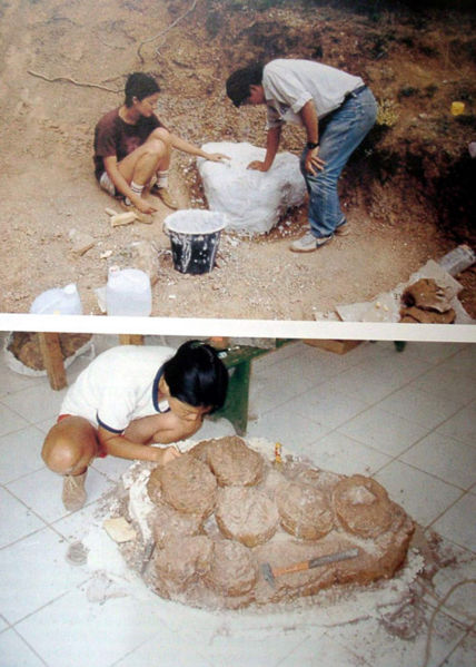Plâtrage et dégagement d’une ponte de dinosaure de Rennes-le-Château (Aude). Image non reproductible, E. Buffetaut.