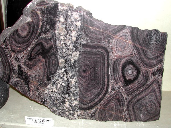 Plaque polie de syénodiorite orbiculaires de Virvik, près de la ville de Porvoo en Finlande. Faciès à gros orbicules montrant les phénoménes de dissolution des orbicules. Echantillon de la collection de l'Ecole des Mines de Paris