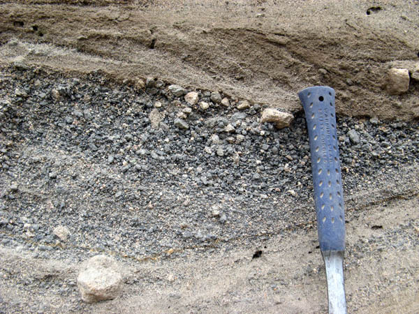 Très belle coupe dans les projections d'un maar (Echamps - Ardèche / France), on observe dans cet affleurement (voir photos "Maar d'Echamps 1, 2 et 3") des dépôts pyroclastiques lités, sombres, peu cohérents. On peut constater l’abondance des débris du socle cristallin au sein des lapilli basaltiques et les changements de granulométrie de couche à couche qui démontrent le fonctionnement rythmique de ce type d’éruption.