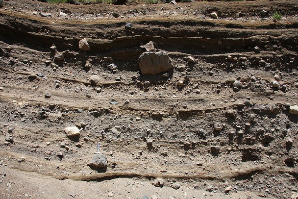 Petite carrière ouverte dans l'anneau pyroclastique du maar du lac de Saint-Front (Haute-Loire / France). On observe une brèche litée (caractère rythmique des explosions), peu cohérente, très riche en fragments du socle : granite et migmatites du Velay. Présence également de nombreux fragments basaltiques de toutes tailles (basalte massif, basalte bulleux, basalte à Zéolites etc...)