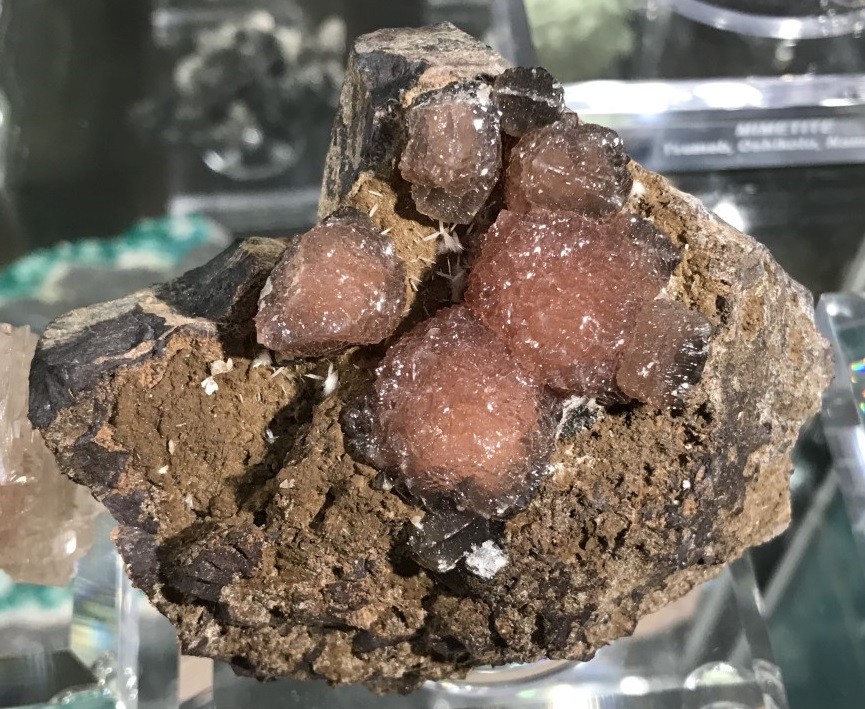 Olmiite (rose) et bultfontéinite (petites aigrettes blanches) Mine N’Chwaning II (Champs Manganésifères du Kalahari, Kuruman, Afrique du Sud).