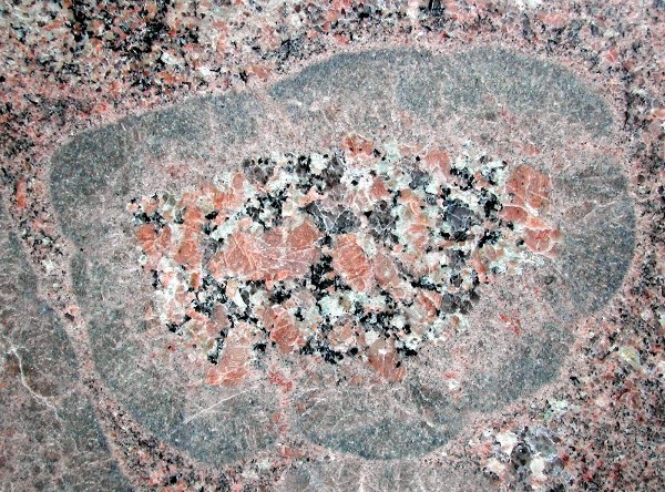 Orbicule simple à noyau granitique identique à la matrice. Occurence de la carrière de La Clarté, Ploumanac'h, Côtes d'Armor.