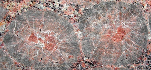 Deux orbicules simples à noyau de plagioclase rose. Occurence de la carrière de La Claté, Ploumanac'h, Côtes d'Armor.