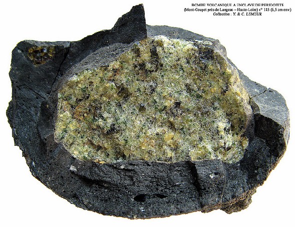 Petite bombe de forme ovoïde, légèrement fuselée, à surface finement scoriacée. Le basalte vitreux est finement bulleux. Au centre, belle enclave de péridotite (4 cm x 6,5 cm env.). On observe très nettement la disposition linéaire des bulles dans le basalte soulignant ainsi la fluidité du magma. Ces noyaux de Péridotites sont communs dans les laves du Velay et constituent souvent, comme ici, le coeur des bombes volcaniques. L'Olivine (silicate de fer et de Magnésium) est le principal minéral des Péridotites et se distingue par sa belle couleur vert-clair ; elle est associée à des Pyroxènes (Silicate de fer, de Magnésium et de Calcium) et des oxydes. Ces péridotites proviennent du manteau supérieur et sont incorporées au magma lors des éruptions volcaniques. Elles font l'objet de nombreuses études car elles permettent de mieux connaître les zones du manteau terrestre situées entre 30 et 60 kms de profondeur pour les plus communes.