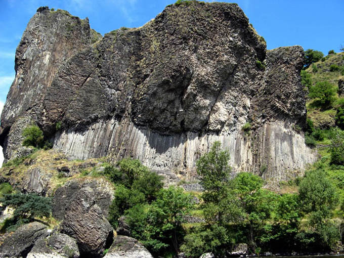 C'est un formidable flot de basalte qui s'est accumulé dans la vallée de l'Allier en cet endroit (Rocher de Prades en Haute-Loire / France). La prismation de la lave (rétractation du magma en cours de refroidissement) est spectaculaire.