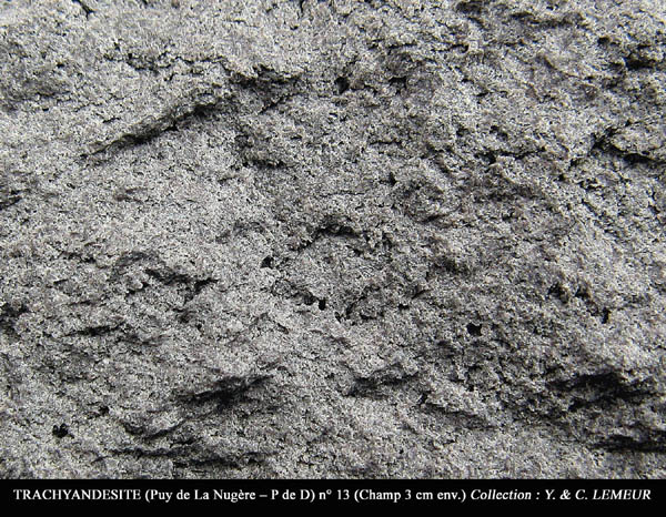 TRACHYANDESITE (Puy de La Nugère – P de D / France) Lave grise, assez massive, montrant très peu de bulles de dégazage ; mésostase vitreuse, grise à microlites blanchâtres. Absence de phénocristaux. (Champ de 3 cm env.)