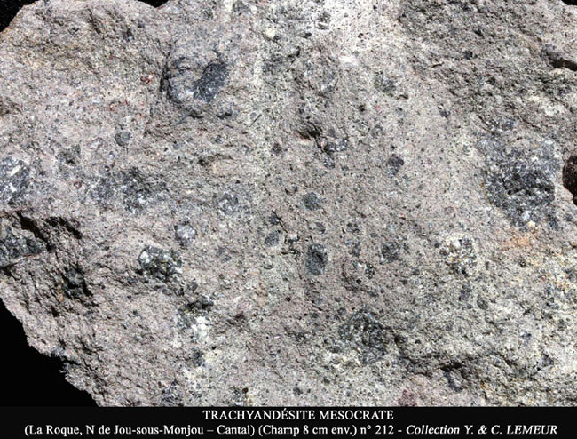 Roche porphyrique, sombre. Parmi les phénocristaux signalons : les feldspaths, les augites, les amphiboles brunes, les biotites, les magnétites et l'apatite. On retrouve les mêmes constituants dans la pâte : feldspaths , augite, magnétite, apatite. Présence d'enclaves diverses et parfois d'olivine.