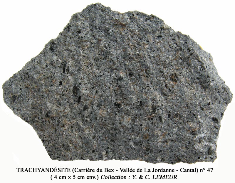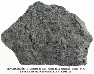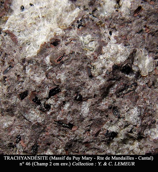 TRACHYANDÉSITE (Massif du Puy Mary - Rte de Mandailles - Cantal) Composition de plagioclase et feldspath alcalin + hornblende et silice (tridymite). Structure microlitique. (Champ de 2 cm env.)