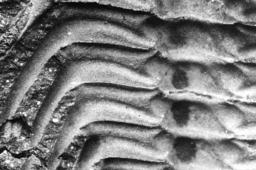 Détail (moule ext.) de la région thoracique de Selenopeltis gallicus (Llandeilo de Château-Gaillard en Bain de Bretagne - I & V) x 5 env.
