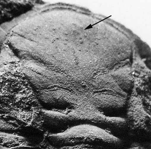 Zone céphalique de Phacopidina micheli montrant la granulation de la bosse glabellaire (Llandeilo de Traveusot en Guichen - I & V) x 10 env.