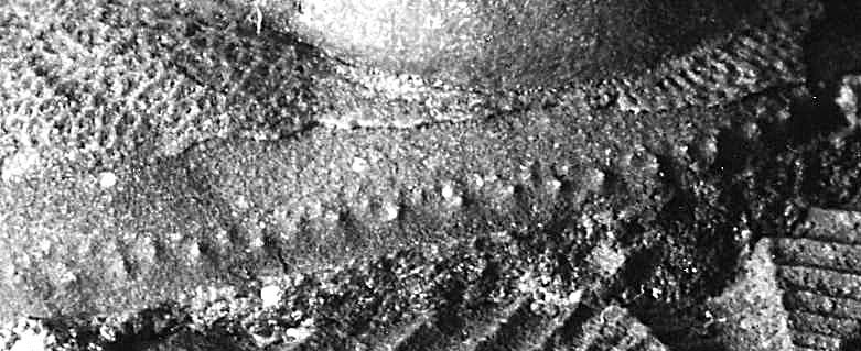 Rangée de tubercules sur la bordure céphalique de Dionide mareki (Llandeilo - Bain de Bretagne) (Champ de 1 cm environ)