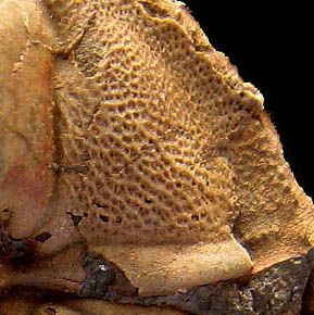 Détail de la joue droite de Dionide mareki montrant de nombreuses rides anastomosées (Llandeilo - Bain de Bretagne - I & V) Champ de 1 cm env.