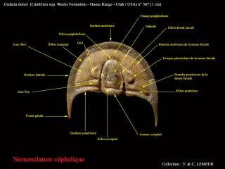 Eléments de nomenclature céphalique (exemple avec Cedaria minor - Cambrien de l'Utah - USA)