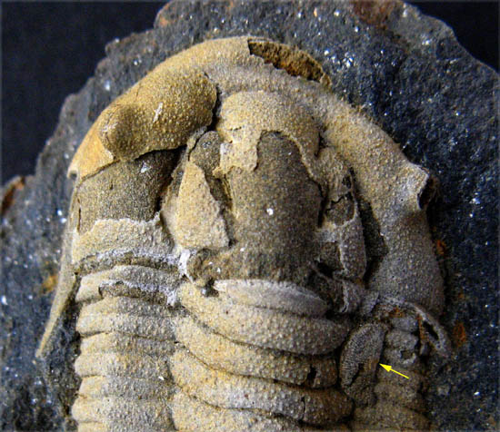 Prionocheilus mendax (Région céphalique)remarquablement conservé dans un nodule fossilifère du Llandeilo de Château-Gaillard en Bain de Bretagne (I & V)Largeur du céphalon 19 mm ; remarquer en bas à droite le brachiopode fixé sur la carapace.