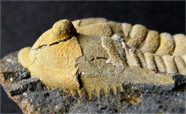 Prionocheilus mendax remarquablement conservé dans un nodule fossilifère du Llandeilo de Château-Gaillard en Bain de Bretagne / vue latérale (I & V) Champ de 25 mm env. Remarquer la rangée d'épines disposées en dents de scie sur la bordure latérale.