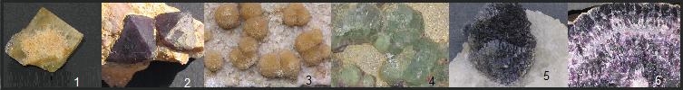 1: Peyrebrune (81), 2: la Barre (63), 3: Buxières les Mines (03), 4: Foisches (09), 5: Puy-Saint-Gulmier (63), 6: Lussac les Églises (87). Fluorines Collection musée ferme de l'orme. |