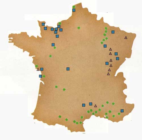 4.2. Carte montrant les principaux gisements de dinosaures connus en France. Triangles violets : Trias. Carrés bleus : Jurassique. Cercles verts : Crétacé.