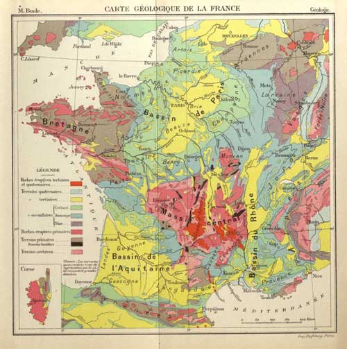 4.1. Carte géologique de la France. Les terrains susceptibles de contenir des restes de dinosaures sont ceux du Trias (en violet), du Jurassique (en bleu) et du Crétacé (en vert).